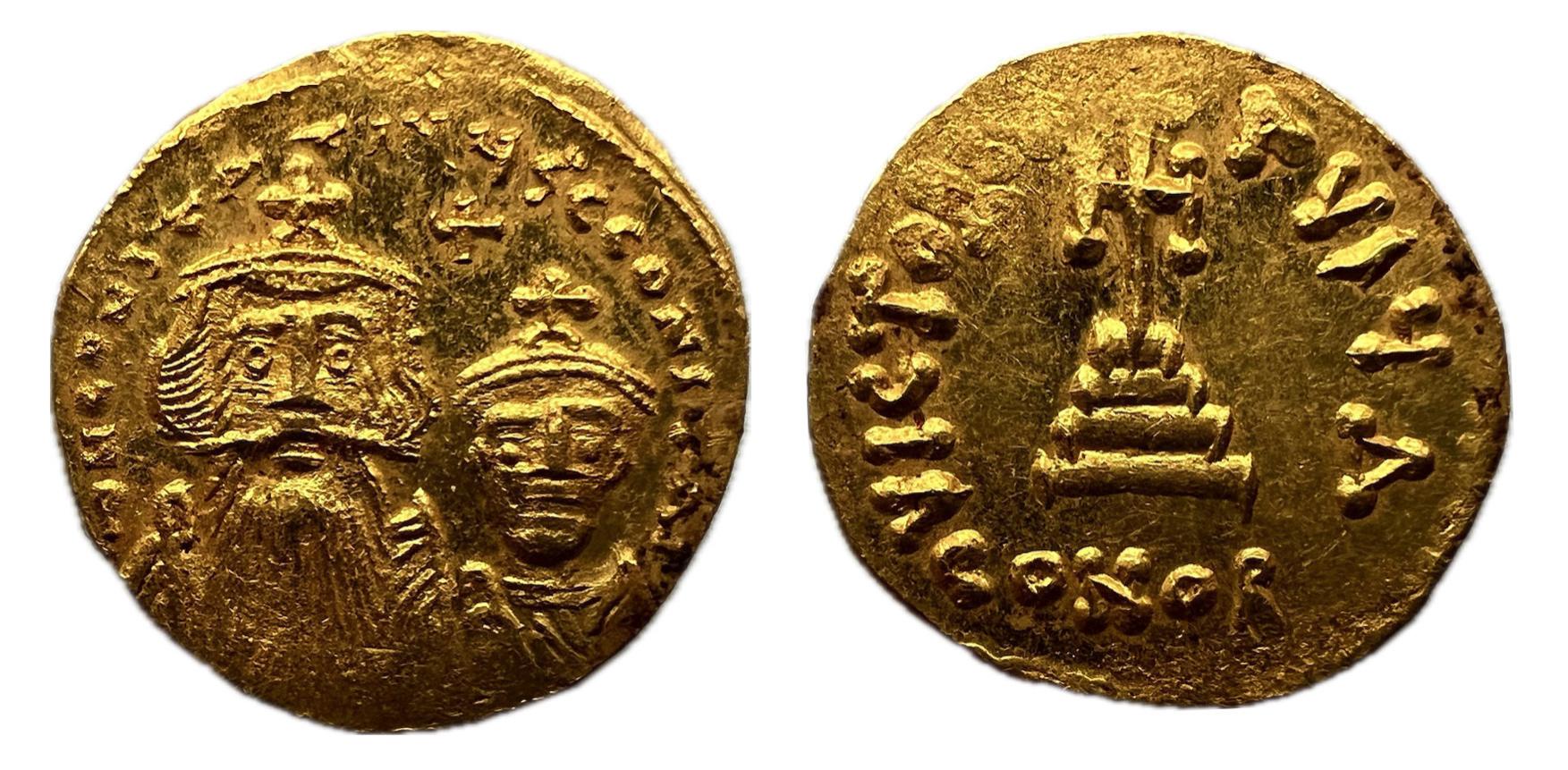 Constans II con Constantino IV. Sólido 641-668. Solidus, alrededor de 654-659. Constantinopolis (DOC 25d. MIB 26. SB 959.) Anv.: δ N CONSTANTINЧS C CONSTANT Busto coronado y drapeado de Constante II de frente, con larga barba y bigotes a la izquierda; busto coronado, drapeado e imberbe de Constantino IV de frente, a la derecha; arriba, cruz. Rev.: VICTORIA AVζЧ Δ / CONOB Cruz potente en base y tres pasos. 4,52 gr EBC. Est…550,00.