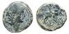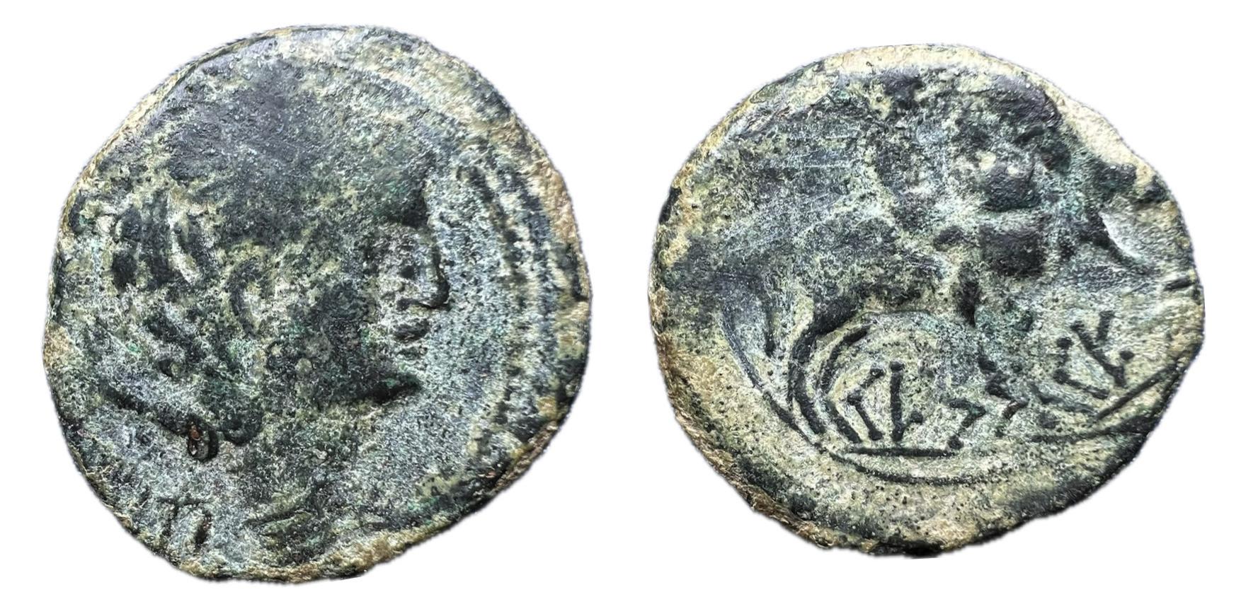 Kese. As. 220-200 a.C. Tarragona. (ACIP 1205) (CNH 170/92 ) (Vives 36/1) ( MIB 1205 | 46/097). Anv.: Cabeza masculina a derecha, detrás letras ibéricas TE. Rev.: Jinete a derecha, con palma, debajo leyenda ibércia KESSE. Ae. 12,46 g. MONEDA MUY CURIOSA. Repinte. MBC. Est...200,00.