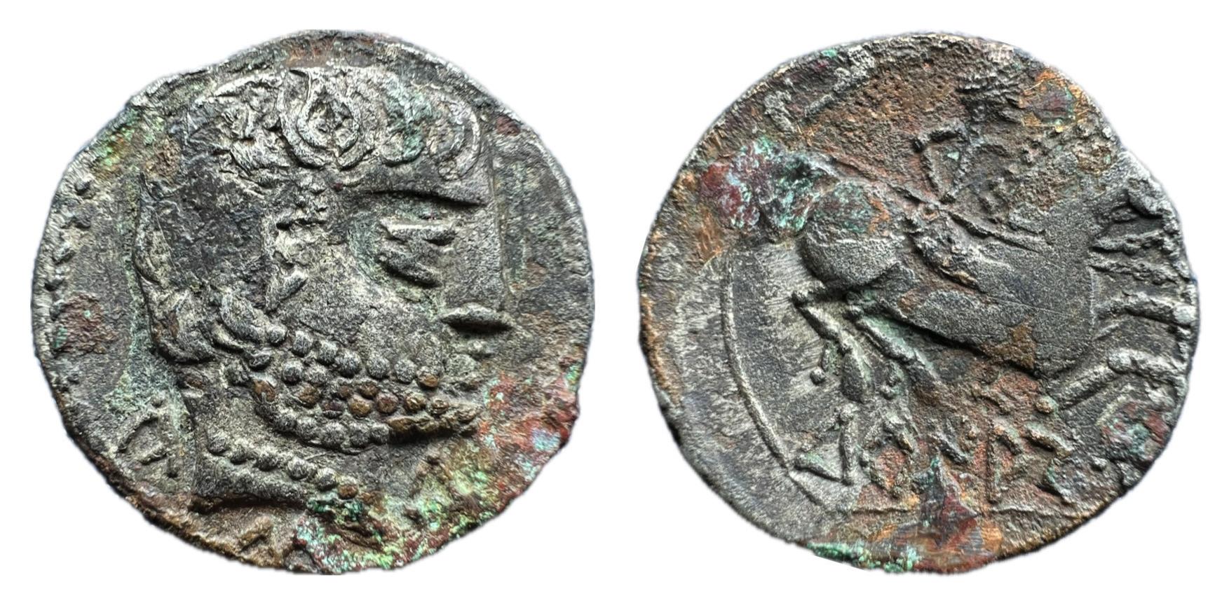 TURIASU, Denario forrado. Tránsito s. II-I a.C. TARAZONA (ZARAGOZA) (NO-CNH). (NO-ACIP). (MIB MIB 1735 | 110/6). A/ Cabeza masculina barbada y con collar a derecha; detrás signo ibérico Ka. Gráfila de puntos. R/ Jinete con lanza cabalgando a derecha; debajo, sobre línea, leyenda en ibérico TuRIASU. Gráfila lineal. AE 2,97 g. . Arte muy degenerado. SOLO 3 EJEMPLARES CONOCIDOS EN MIB. Este mismo ejemplar es uno de ellos. Oxidaciones limpiadas. EXTREMA RAREZA. MBC. Est...500,00.